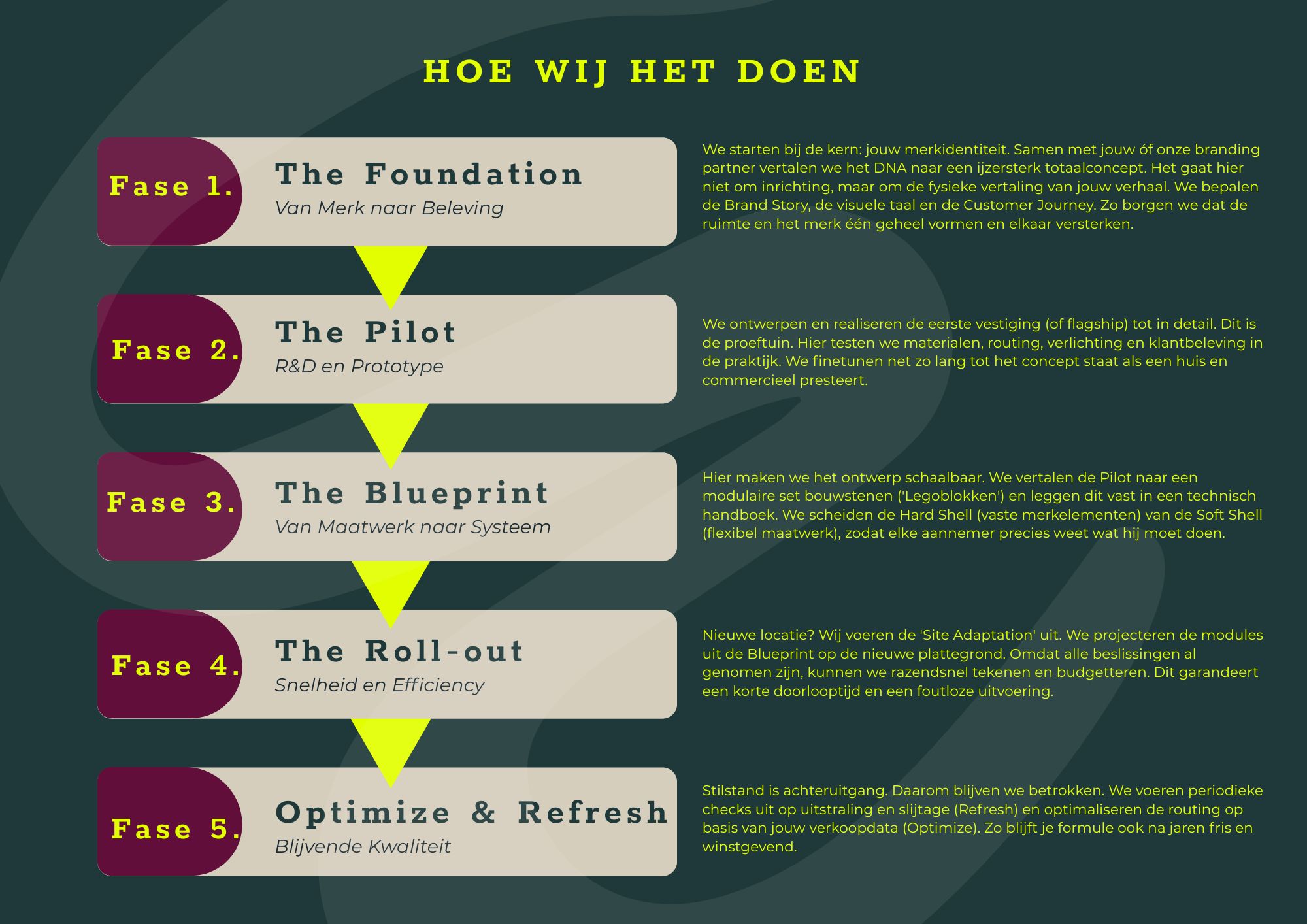 - Consistentie: Elke vestiging ademt 100% hetzelfde merk-DNA